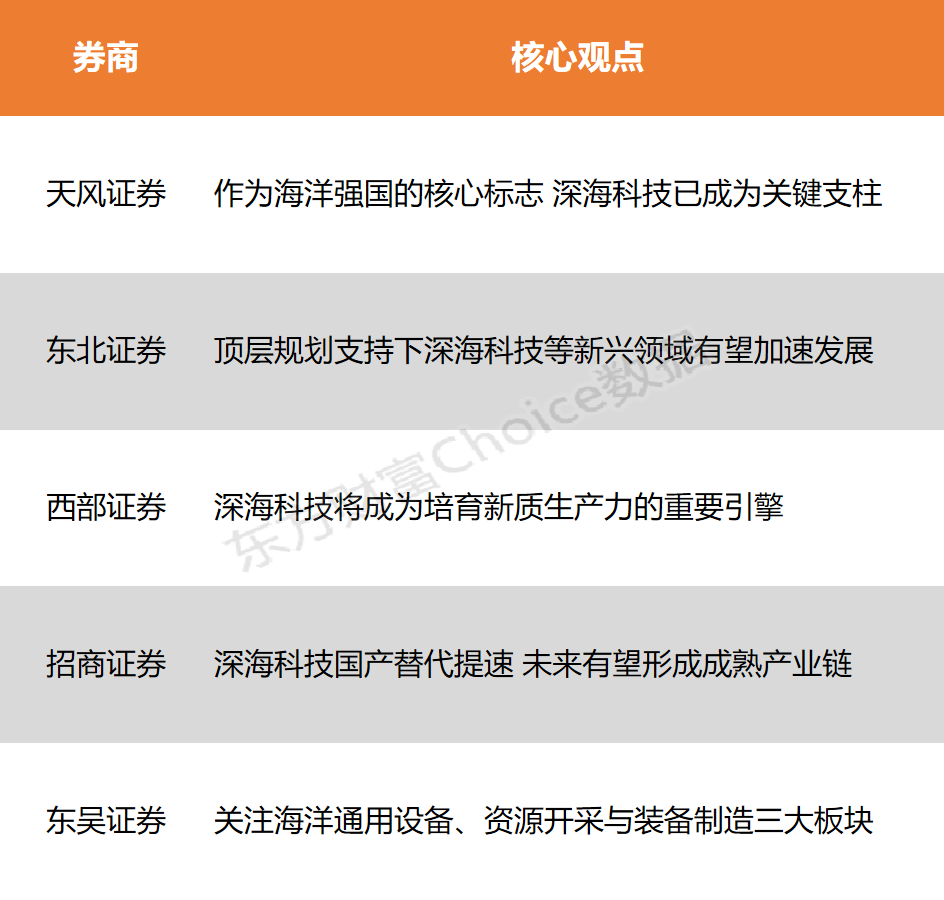 中央财经委员会第六次会议指出,推动海洋经济高质量发展,要加强顶层设计,加大政策支持力度,鼓励引导社会资本积极参与发展海洋经济。天风证券表示,作为海洋强国的核心标志,在此战略框架下,深海科技已成为关键支柱;东北证券认为,发展深海科技具备经济以及战略双重意义,顶层规划支持下深海科技等新兴领域有望加速发展;招商证券指出,在政策扶持下,深海科技国产替代提速,未来有望形成成熟产业链。