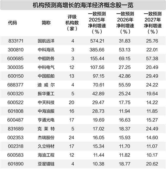 部分海洋经济概念股成长潜力较大。据数据宝统计,有3家及以上机构评级的海洋经济概念股中,机构一致预测今后三年净利增速均超10%的个股有15只。其中,国航远洋、中科海讯、中船防务等6只个股机构预测今后三年净利增速均超20%,未来发展值得期待。