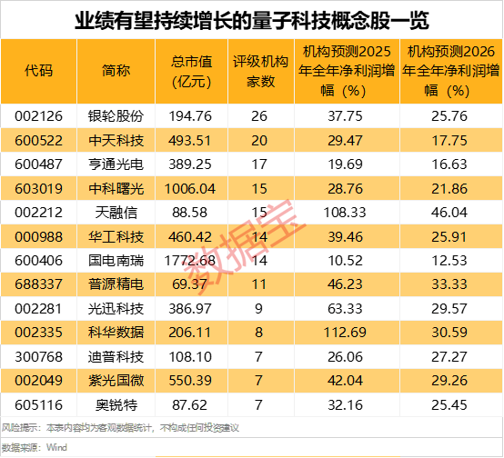 从业绩预期来看,超5家机构给予评级的概念股中,有13股2025—2026年净利润有望持续增长超10%。