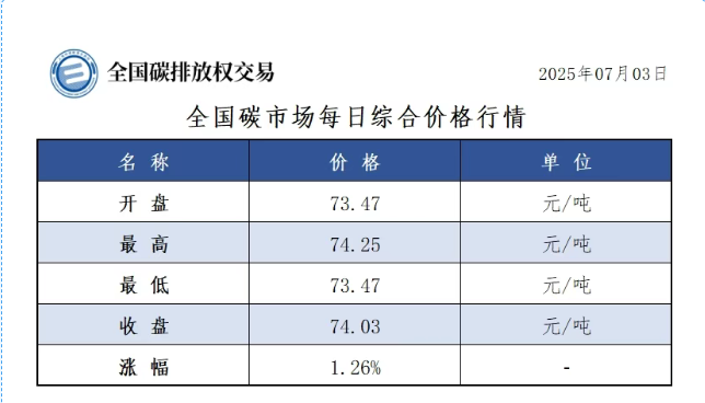 新华财经北京7月3日电据微信公众号“全国碳交易”,今日全国碳市场综合价格行情为: 开盘价73.47元/吨,最高价74.25元/吨,最低价73.47元/吨,收盘价74.03元/吨,收盘价较前一日上涨1.26%。