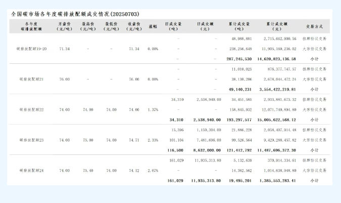 2025年1月1日至7月3日,全国碳市场碳排放配额成交量40,322,607吨,成交额3,021,390,476.71元。碳市场的发展对于推动绿色低碳转型具有重要意义,通过市场机制促进减排。