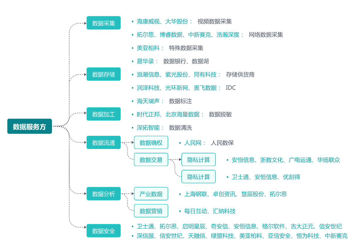 此外,数据要素产业链还包括数据交易所,一些上市公司也有参股数据交易所。以及保障数据要素网络安全的厂商。