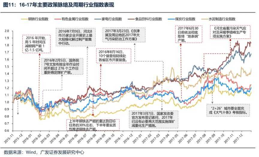 2016 - 2017:供给侧改革,企业产能过剩、杠杆高企,政策以“去产能”“环保限产”为主,政策周期贯穿2年,广义财政扩张支持棚改货币化带动地产链需求侧共振改善,【经济周期类】资产行情持续性更好,辐射至后周期类品种。