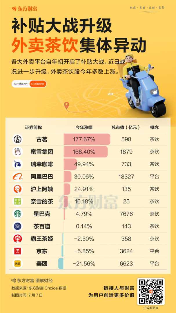 7月7日港股市场新式茶饮赛道集体走强,茶百道、古茗等涨幅显著。阿里、美团、京东三大外卖平台补贴大战升级,高盛预计价格战9月达峰值。新式茶饮赛道或成最大赢家,华鑫证券建议关注机会。