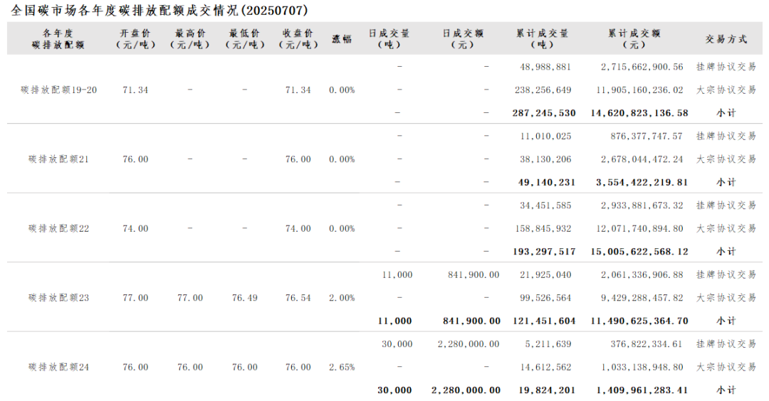 2025年1月1日至7月7日,全国碳市场碳排放配额成交量40,690,419吨,成交额3,048,727,469.11元。长期交易数据的积累,为分析碳市场发展趋势提供了宝贵资料。