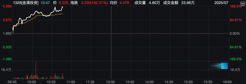 7月8日,港股金涌投资开盘后持续走高,一度涨近170%,截至发稿,报5.22港元/股,涨幅162.31%。