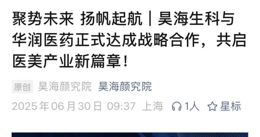 近期,华润医药与“玻尿酸三巨头”之一昊海生科在医美领域携手,构建“研发-生产-渠道”的全链路合作。至此,四大医药流通巨头——国药、上海医药、华润医药、九州通,均已迈入医美圈。