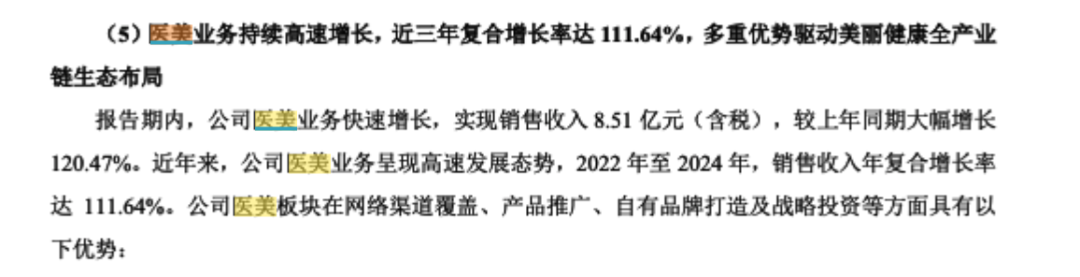但九州通的医美业务却呈现持续快速增长,2024年实现销售收入8.51亿元,较上年同期大幅增长120.47%,近三年复合增长率达111.64%。
