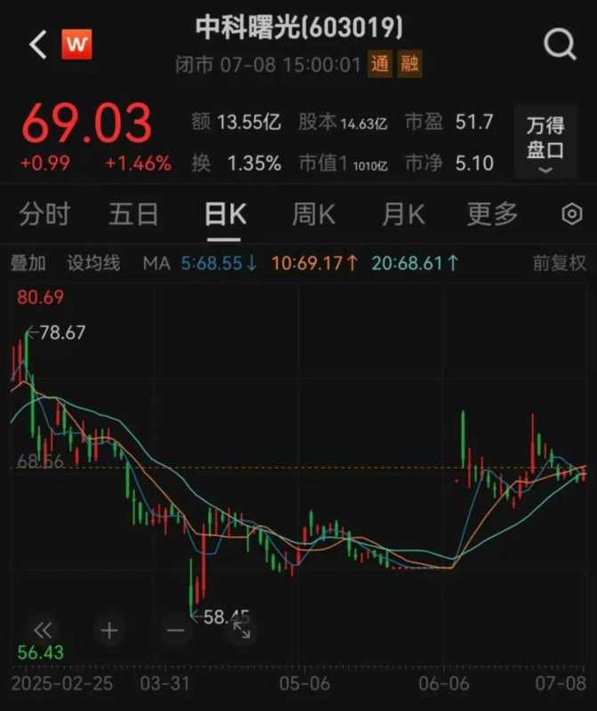 7月8日,中科曙光股价以69.03元/股报收,最新市值为1010亿元;中科星图午后股价突然拉升,最终股价以36.35元/股报收,最新市值为294亿元。