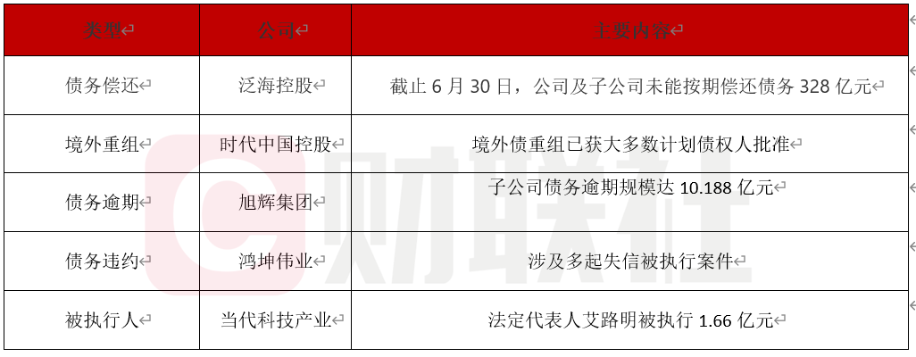 时代中国控股有存续中资离岸债7只,存续余额为31.500亿美元。【旭辉集团:子公司债务逾期规模达10.188亿元】旭辉集团股份有限公司发布公告称,截至2025年7月2日,公司子公司发生债务逾期合计10.188亿元,涉及六安卓锦、杭州昌展等9家公司。7月2日,旭辉集团股份有限公司公告,因未履行福建省福州市中级人民法院判决,被列为失信被执行人,涉及执行标的5.035亿元。