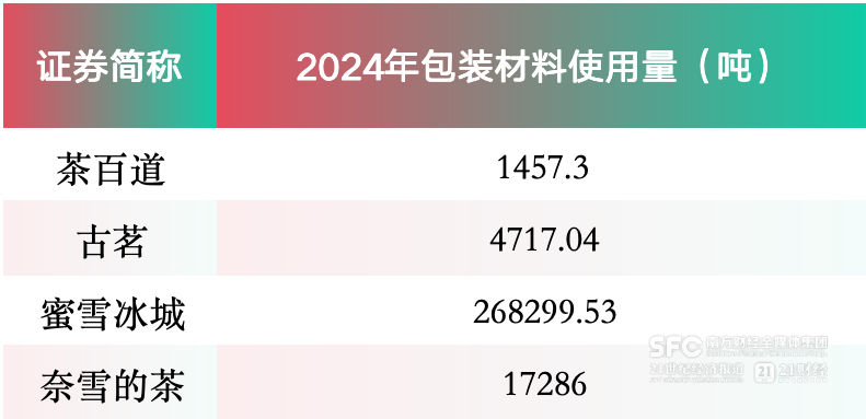 奶茶杯减塑方面,蜜雪冰城、茶百道、古茗和奈雪的茶全部披露了2024年包装材料使用量。施懿宸介绍,新茶饮企业可以从“可持续包装”和“资源节约、循环利用”两方面入手治理塑料污染。