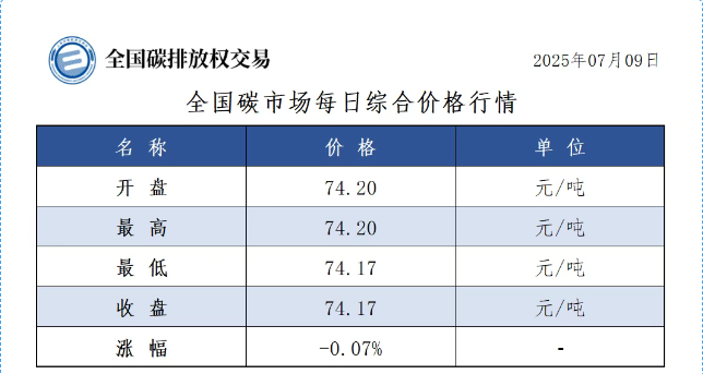 新华财经北京7月9日电据微信公众号“全国碳交易”,今日全国碳市场综合价格行情为: 开盘价74.20元/吨,最高价74.20元/吨,最低价74.17元/吨,收盘价74.17元/吨,收盘价较前一日下跌0.07%。碳市场交易动态持续受关注。