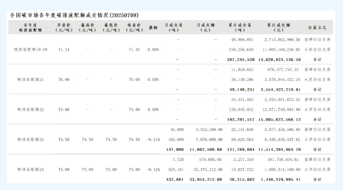 2025年1月1日至7月9日,全国碳市场碳排放配额成交量41,499,300吨,成交额3,110,806,781.11元。碳市场长期趋势向好。