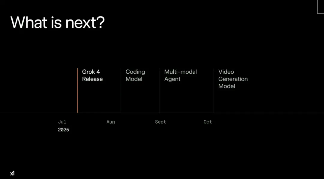 xAI对未来较为乐观。xAI团队希望,能够利用X上庞大且不断更新的数据档案来训练其模型。xAI乐观地预计将在2027年实现盈利。在此次直播中,团队定下目标,在8月发布编程模型,9月发布多智能体,10月发布视频生成模型。