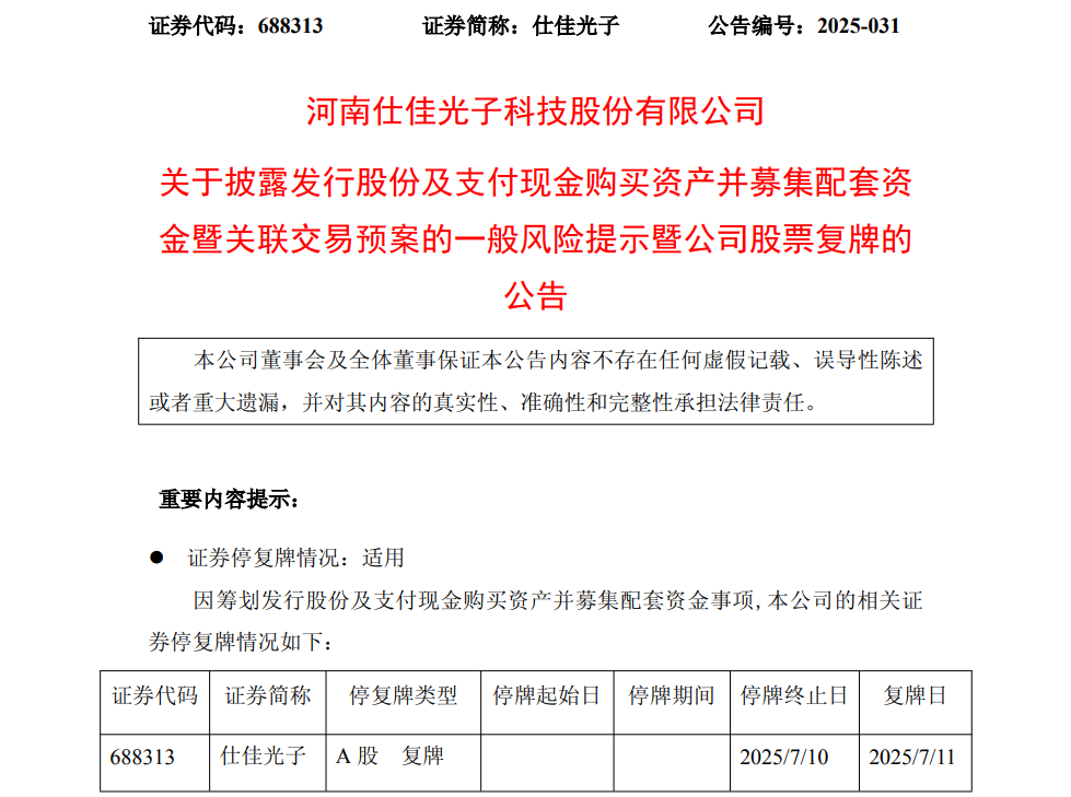 经申请,仕佳光子股票将于7月11日(星期五)开市起复牌。
