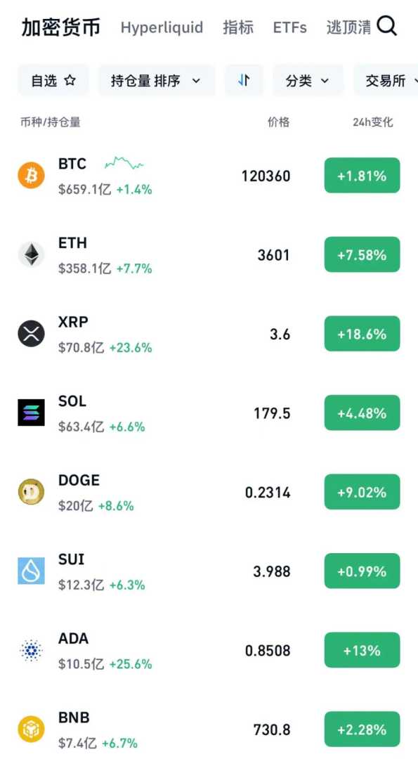 加密货币市场方面,比特币从11.85万美元短线拉升,截至发稿突破12万美元,涨幅近2%。加密货币、以太坊、XRP等涨幅较大,截至发稿,以太坊涨超7%,突破3600美元关口,逼近年内高点。XRP涨近19%,ADA涨13%,狗狗币涨超9%。