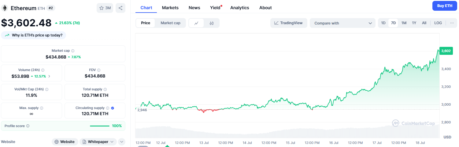 根据CoinMarketCap数据,以太币在过去七天内价格上涨了21.7%,24小时内上涨7.86%,突破3600美元。