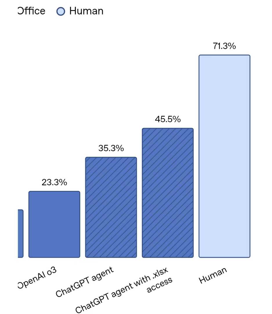 不过,虽然ChatGPT Agent在SpreadsheetBench测试(评估模型编辑真实场景电子表格的能力)中,表现超过OpenAI的其他模型,但其最高得分45.5%还是远低于人类得分71.3%。