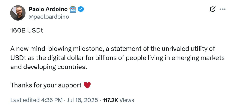 在周三的一篇X帖子中,Ardoino称这一成就证明了USDT作为“新兴市场和发展中国家数十亿人”的数字美元的作用日益增强。