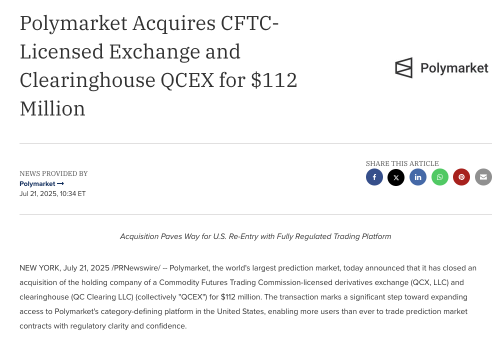 根据周一发布的公告,Polymarket将以1.12亿美元收购不为人知的衍生品交易所和清算所QCX。QCX于2022年向CFTC申请交易牌照,直到今年7月9日才获批。
