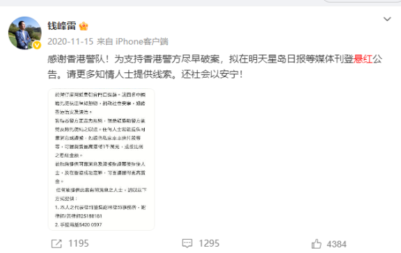 2020年,钱峰雷因为在香港遇袭并发布天价悬赏公告再次引发关注。2020年11月15日,钱峰雷在微博发文称,拟刊登悬红公告,协助警方缉凶及将凶徒绳之以法,提供可靠消息者,奖赏最高1000万港元,成为香港有史以来悬红最高奖金。