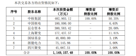 交易完成后,中国聚变公司注册资本为150亿元。其中,中国核电拟出资10亿元,持股6.65%,浙能电力拟出资7.51亿元,持股5%。据悉,对此次增资额,各增资方在1年内、2年内和3年内出资达到实际出资金额总额的60%、80%和100%。