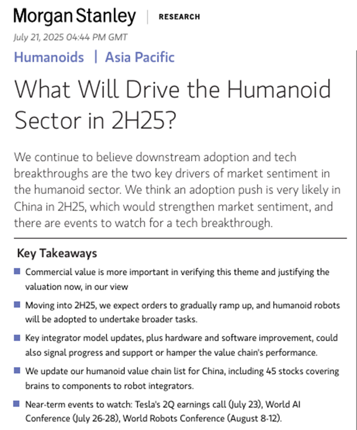 2025年下半年,摩根士丹利预计首批人形机器人订单与应用落地可期。除内部场景及科研机构采购外,2025下半年将出现更多商业化订单,从而支撑板块表现。摩根士丹利提及,最近中国已经出现了几笔较大规模的机器人商用订单,这一事实支撑了他们的观点。