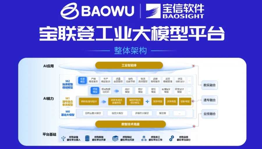 宝信软件的宝联登工业大模型,以平台、数据、算力、模型、场景“五位一体”为核心,分层构建M0、M1和M2模型。通过大语言、视觉、决策、预测模型等,结合边缘推理和智能可视化系统,覆盖从数据处理到场景应用的全生命周期,形成行业垂类模型的完整技术闭环,推动人工智能在工业领域的应用。