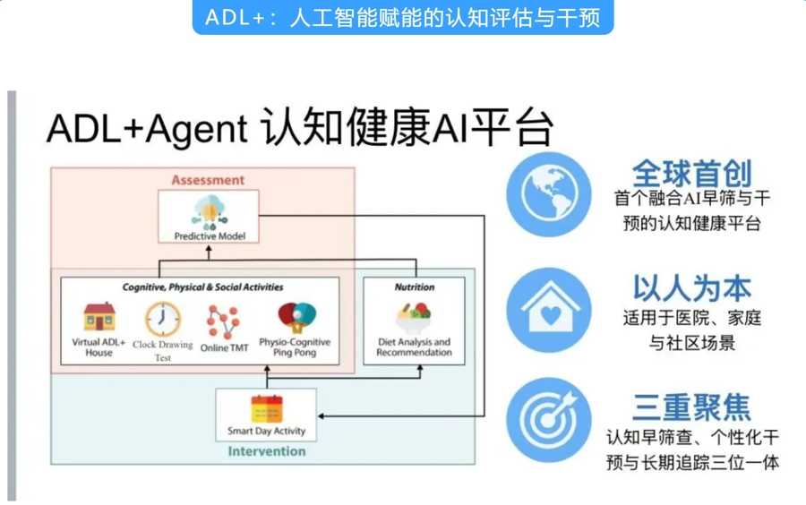 “ADL+”,是全球首个面向社区与家庭部署的AI个性化认知照护平台,整合早筛、干预、跟踪与陪伴功能,融合多模态感知与混合专家模型,提升精准度,通过游戏化设计增强参与度,能有效延缓认知衰退,是人工智能在医疗领域的创新应用。
