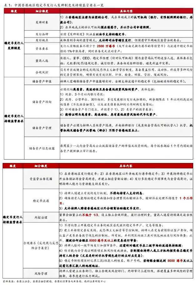 2.1 关注点一:谁能申请稳定币发行牌照,具体怎么发牌?根据香港金管局文件,香港地区注册的公司及获认可机构可直接申请,异地成立的非认可机构须先在港设立附属公司。财务资源门槛方面,申请人实缴股本不得少于2500万港币与流通中稳定币面值1%中孰高者,同时须储备充足流动资产。