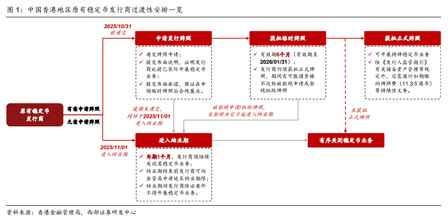 2.2 关注点二:现在已经在香港地区发行稳定币或有实质业务的发行商怎么办?香港金管局为其提供过渡性安排:有意继续经营需在2025年10月31日前递交申请,并提供书面证明及承诺,经审核可获颁临时牌照,在未来6个月内继续开展稳定币业务。