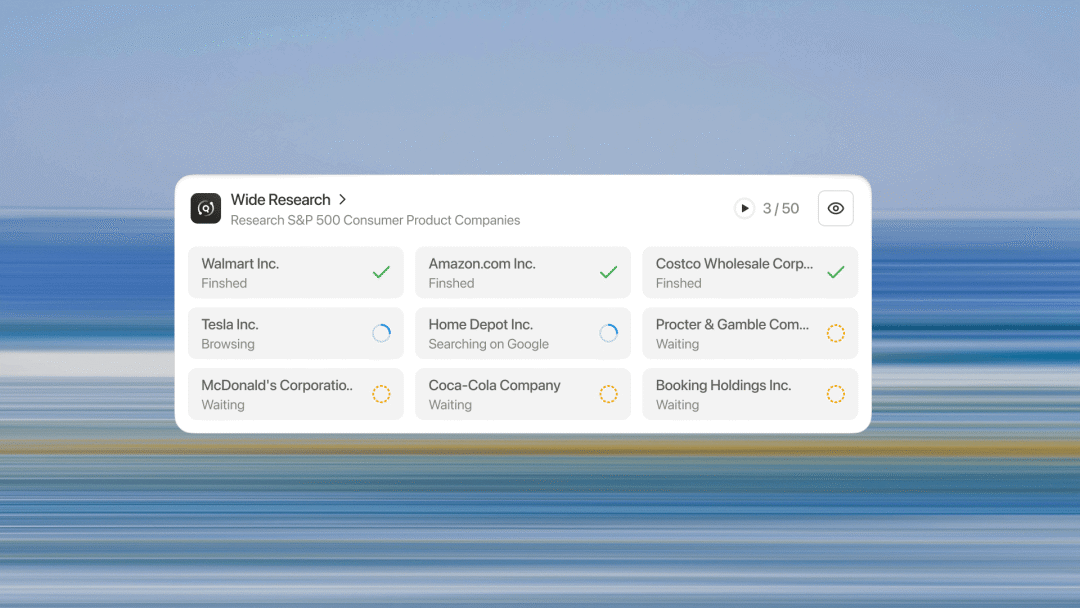 通过Wide Research功能,则是将几百家公司的信息,分配给几十个甚至上百个子AI智能体同时搜索。由于每个子智能体都具有完备功能,可独立进行信息搜索,只需将各自的结果反馈给主任务,最终由主任务根据用户的需要,生成文本或图片。