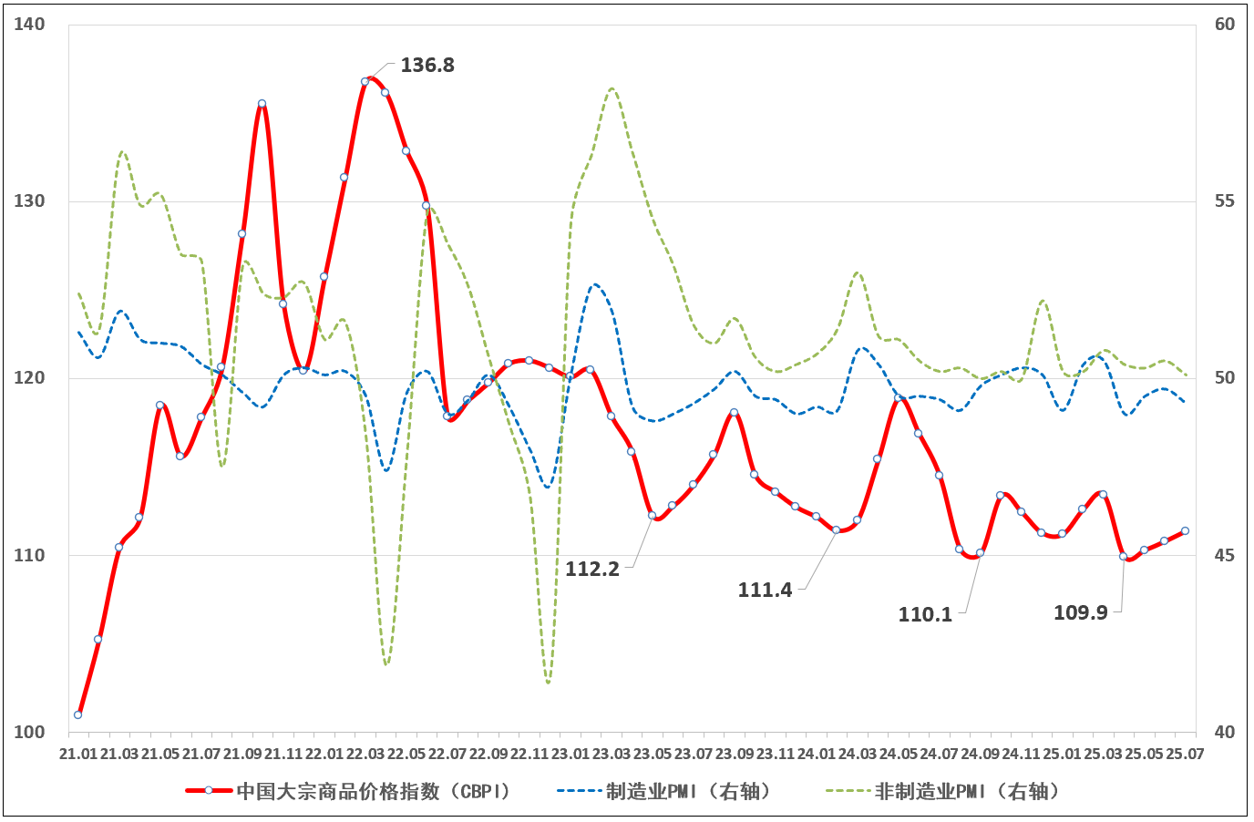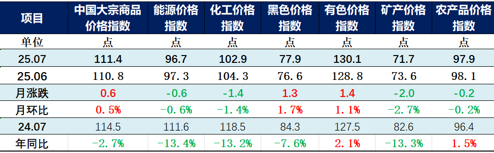 2025年7月中国大宗商品价格指数环比上涨0.5%,同比下跌2.7%。黑色、有色价格指数上涨,农产品小幅回落。焦煤、碳酸锂、工业硅价格涨幅显著,甲醇、水泥和PTA跌幅居前。