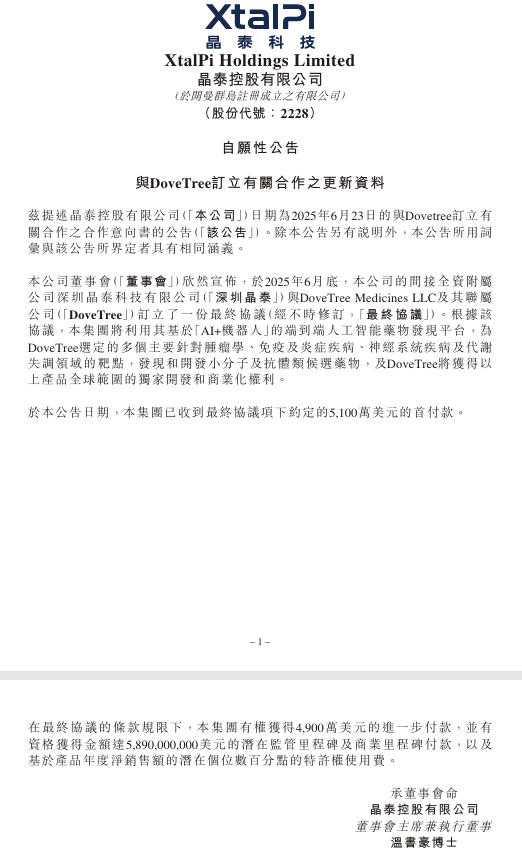 8月5日,晶泰控股发布公告,其间接全资附属公司深圳晶泰科技有限公司宣布与DoveTree完成总订单规模近60亿美元的管线合作签约。