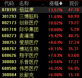 8月8日,受利好消息影响,脑机接口概念早盘拉升,截至发稿,倍益康13%涨停,三博脑科涨超11%,创新医疗、际华集团涨停,麦澜德、爱朋医疗、博拓生物等多股跟涨。