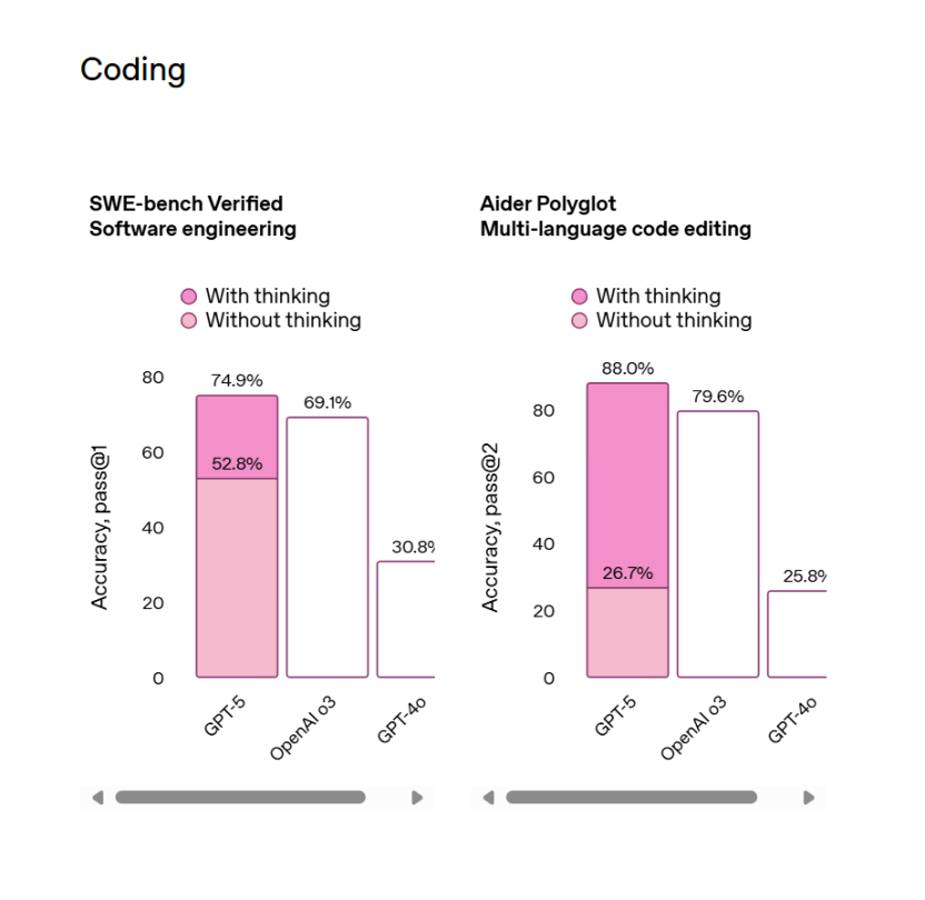 据介绍,GPT-5在关键编程基准测试中达到SOTA级别。数据显示,GPT-5在基于真实软件工程任务的SWE-benchVerified测试中得分74.9%,在评估代码编辑能力的AiderPolyglot测试中得分88%。