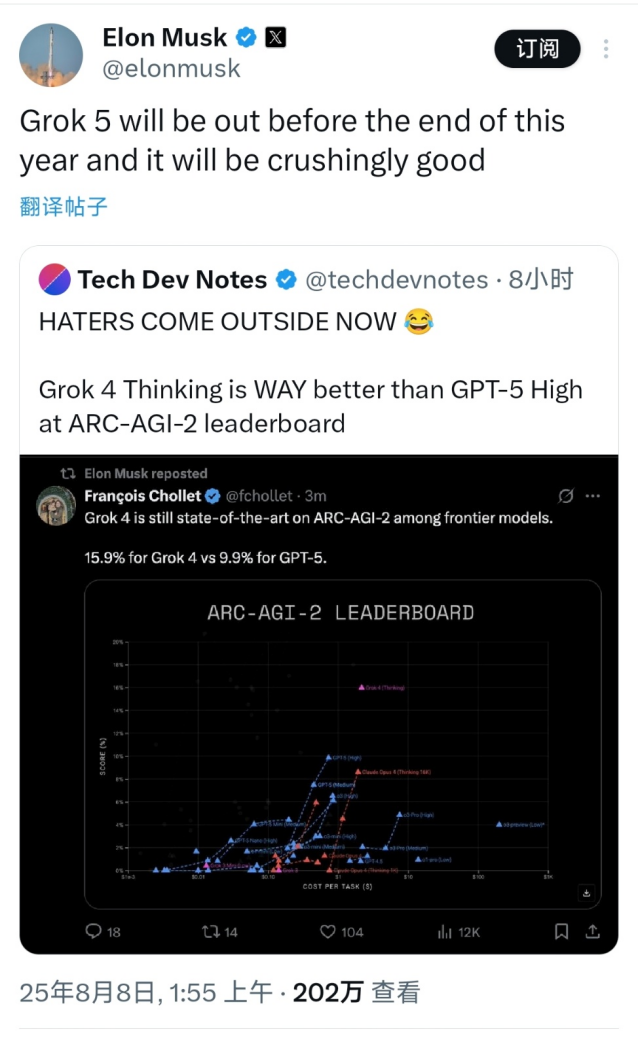 值得关注的是,埃隆·马斯克也发文表示,Grok4在ARC-AGI测试中击败了GPT-5,并透露Grok5将于今年年底前发布,预计表现将更加出色。