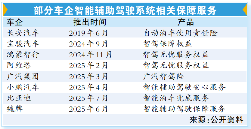 据不完全统计,截至目前,约有11家车企先后推出了诸如“智驾险”“智驾保”“智驾无忧服务”等,额度从100万元到600万元不等的辅助驾驶兜底方案。为开展此类服务,有的车企直接与保险公司开展合作,但仍有个别车企并未公开合作保险公司信息,保障形式更类似延保服务。