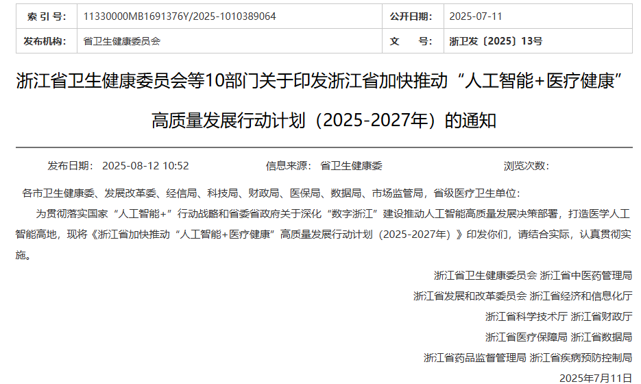 日前,浙江省卫生健康委员会等10部门印发《浙江省加快推动“人工智能+医疗健康”高质量发展行动计划(2025—2027年)》。其中提到,到2027年,全面建成国家人工智能医疗行业应用基地,打造以安诊儿医疗大模型为核心的医疗智能体集群,培育50个以上高质量行业语料库和专病专科模型,突破转化10项以上医学AI核心技术,建设面向公众、医生、医院、科研、产业、政府等6大领域100个以上医疗健康重点场景,培育一批医学人工智能创新型企业和复合型人才,构建从基础设施保障、关键技术攻关到创新应用示范的医疗人工智能创新链、服务链、产业链,形成辐射全国的政企研医协同网络。