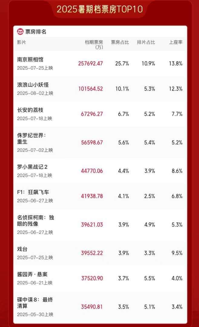 2025年暑期档票房突破100亿元,观影人次达2.67亿。《南京照相馆》与《浪浪山小妖怪》票房分别达25.77亿和10.16亿,创多项影史纪录。多部影片获各自领域内地票房冠军。