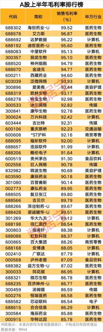 建筑材料和综合行业的毛利率分别提升2.36个百分点和1.91个百分点。从个股来看,销售毛利率居前的以医药生物和计算机行业个股居多,上半年毛利率前五名依次是海创药业-U、艾力斯、达梦数据、迪哲医药-U、中望软件。海创药业-U以99.52%的销售毛利率排名第一,上半年毛利率在90%以上的个股有27只,凸显产业经讯中创新药企业的竞争力。