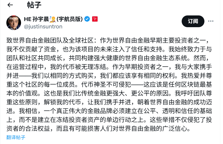 在一则致“世界自由金融团队”的X帖子中,孙宇晨写道:“在运营过程中,我的代币被不合理地冻结。”他要求团队解锁,此事件暴露了加密货币市场中的投资者权益问题。