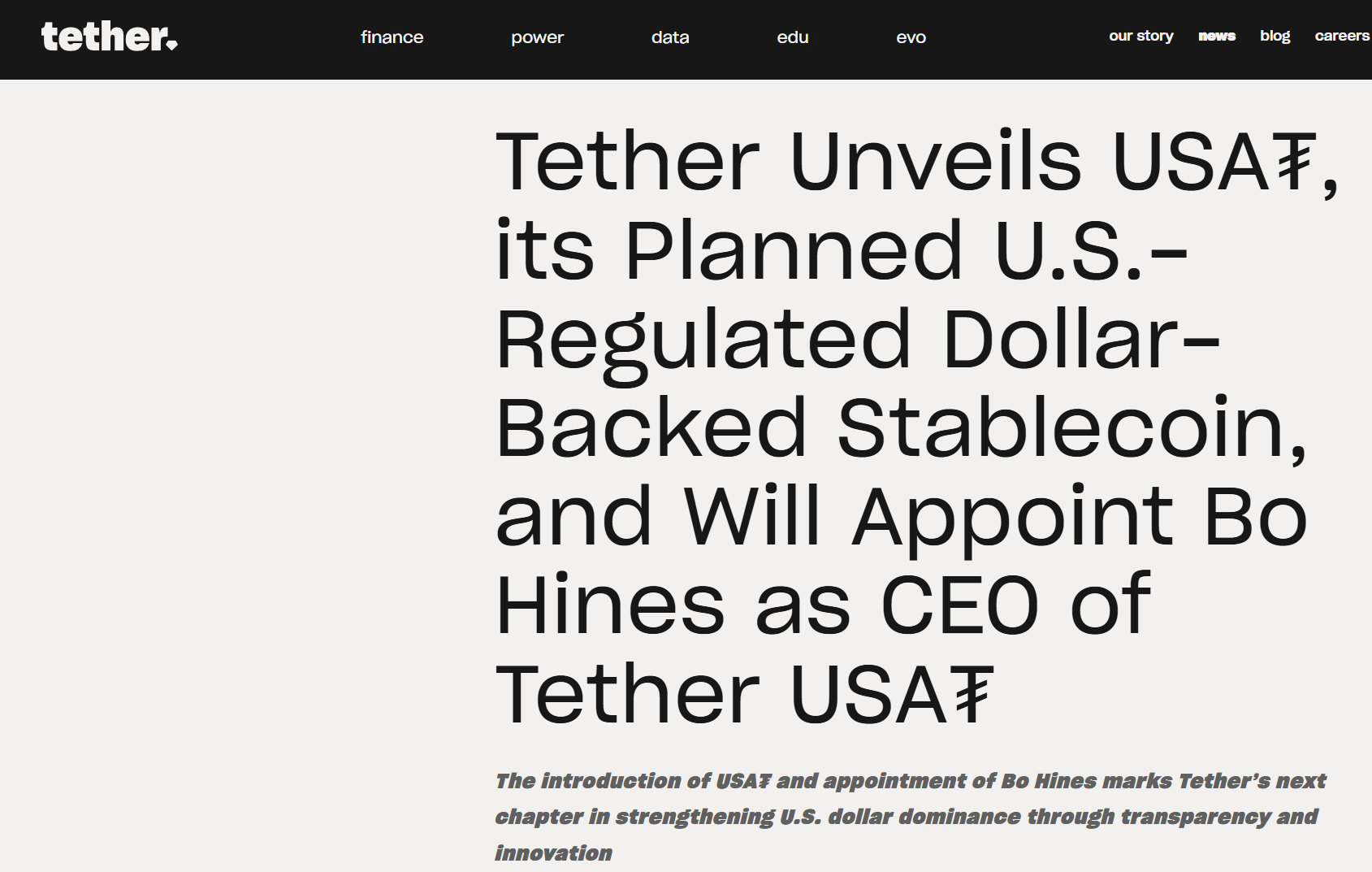 全球最大稳定币USDT的发行商Tether周五宣布,将参照美国稳定币法案发行全新稳定币USAT,并任命前白宫顾问博·海因斯领导Tether的美国业务,这一举措标志着加密货币领域的重要进展。