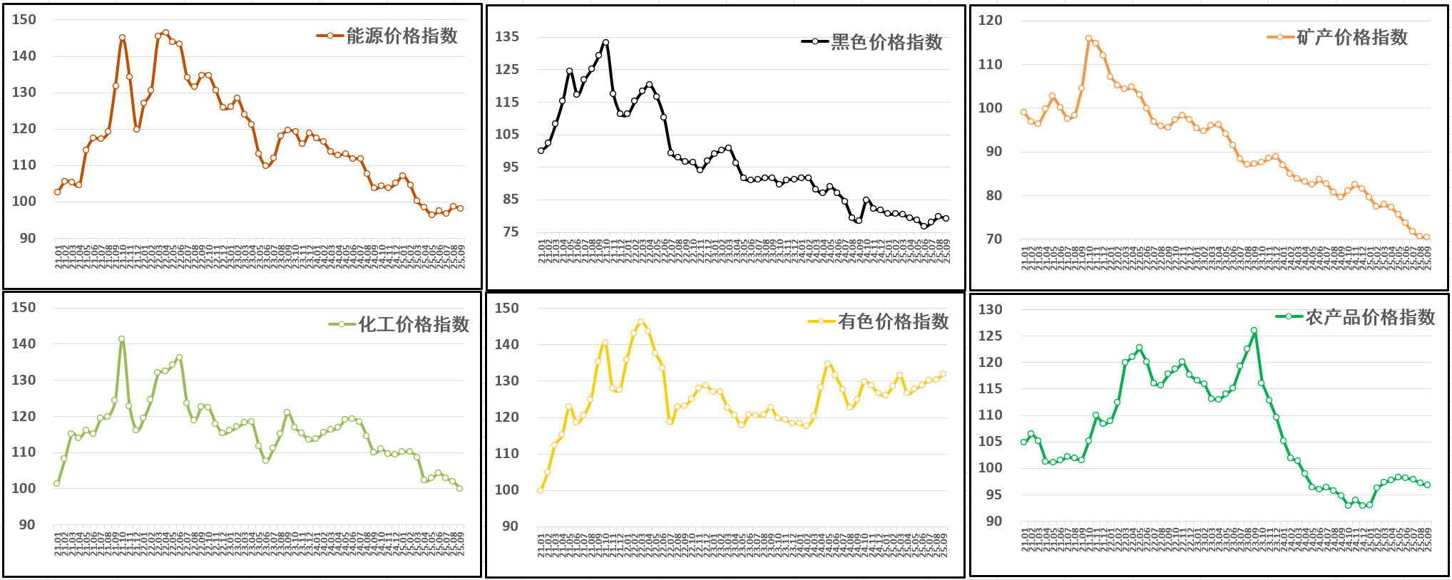 9月,矿产价格指数低位震荡,报70.4点,月环比下跌0.1%,年同比下跌11.4%;农产品价格指数小幅下行,报96.7点,月环比下跌0.4%,年同比上涨2.1%;能源价格指数略有回落,报98.0点,月环比下跌0.7%,年同比下跌5.4%;化工价格指数延续跌势,报100.0点,月环比下跌1.9%,年同比下跌9.1%。