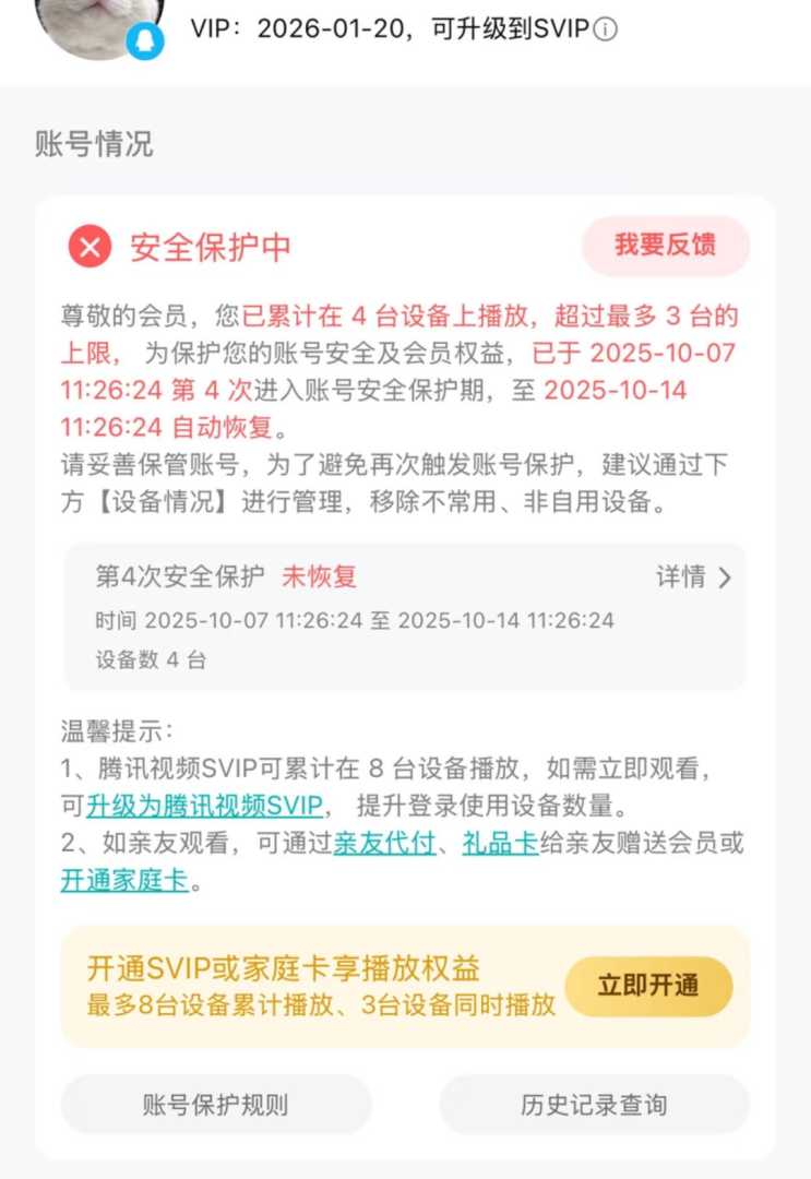 《科创板日报》10月9日讯 近日,“腾讯视频VIP设备超限被封号7天”事件,在网络上引发广泛关注与讨论,这起事件凸显了版权保护与用户体验之间的微妙平衡。有网友晒出其App页面截图显示,其腾讯视频VIP账号已累计在4台设备上播放,超过最多3台的上限,为保护账号安全及会员权益,已于10月7日进入第4次账号保护期,至10月14日自动恢复。