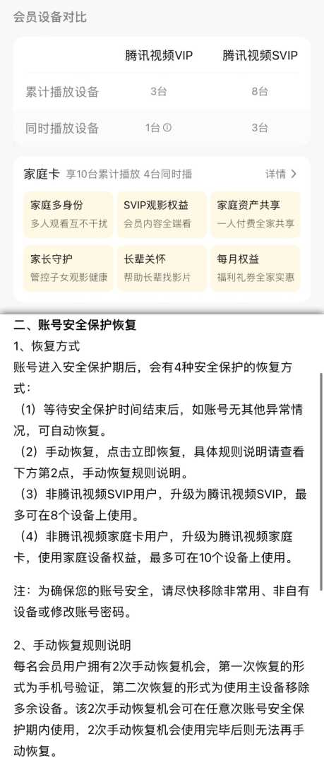 当账号进入安全保护期,用户可通过4种方式恢复使用:用户可等待保护期结束后系统自动恢复;也可选择手动恢复,需要注意的是,每位会员仅拥有两次手动恢复机会,第一次为手机号验证,第二次为使用主设备移除多余设备,而2次机会使用完毕后则无法再手动恢复;此外,用户还可通过升级至SVIP会员或开通腾讯视频家庭卡,以解锁权限的方式恢复账户。