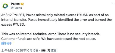 Paxos随后发布公告称,这起事件是公司在进行内部转账时错误铸造了超额的PYUSD。事发后,公司在第一时间发现错误,并销毁了超额部分。Paxos强调,此次事件属于内部技术故障,不存在安全漏洞,客户资金也安全无虞,稳定币市场秩序未受根本性影响。
