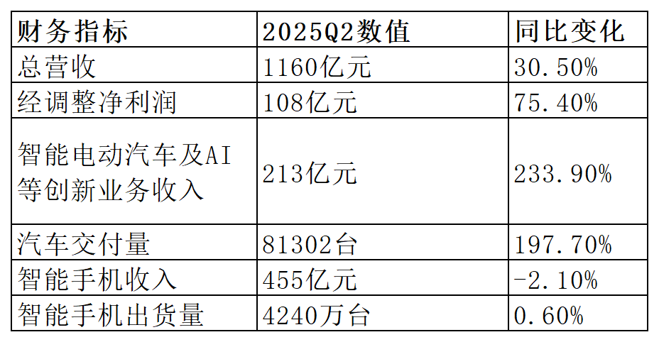 小米2025年第二季度财报表现强劲,总营收达1160亿元,同比增长30.5%;经调整净利润为108亿元,同比大幅增长75.4%。增长主要得益于智能电动汽车等创新业务的爆发,展现出小米多元业务布局的成效。