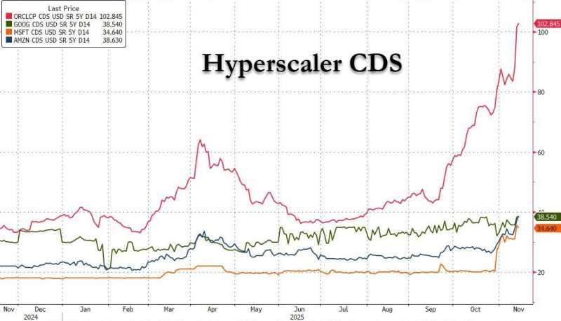 标普全球的数据显示,在旺盛需求推动下,甲骨文和Alphabet的信用违约互换(CDS)交易价格已达到两年来的最高水平,而Meta和微软的CDS合约近几周也出现大幅上涨。数据显示,甲骨文五年期CDS利差上周突破105个基点,Alphabet和亚马逊交易价约为38个基点,微软约为34个基点。