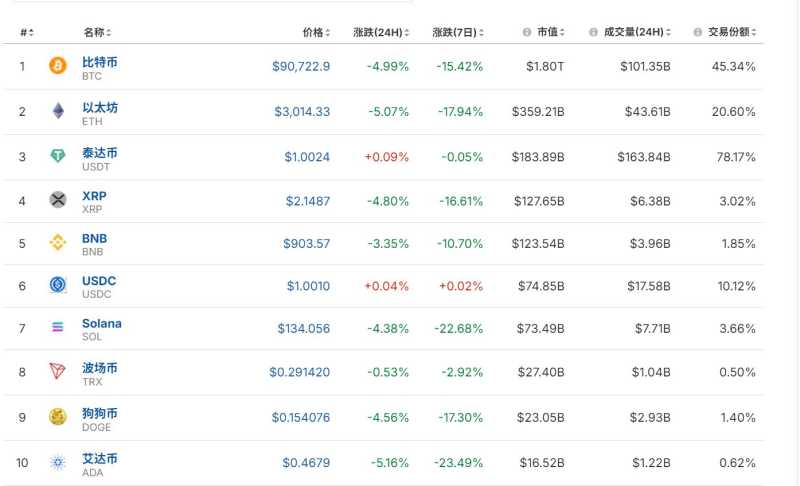 截至发稿,比特币报90722.9美元,跌幅4.99%。以太坊、艾达币跌超5%,狗狗币跌4.56%,其他主流加密货币也纷纷走低,市场呈现普跌态势。